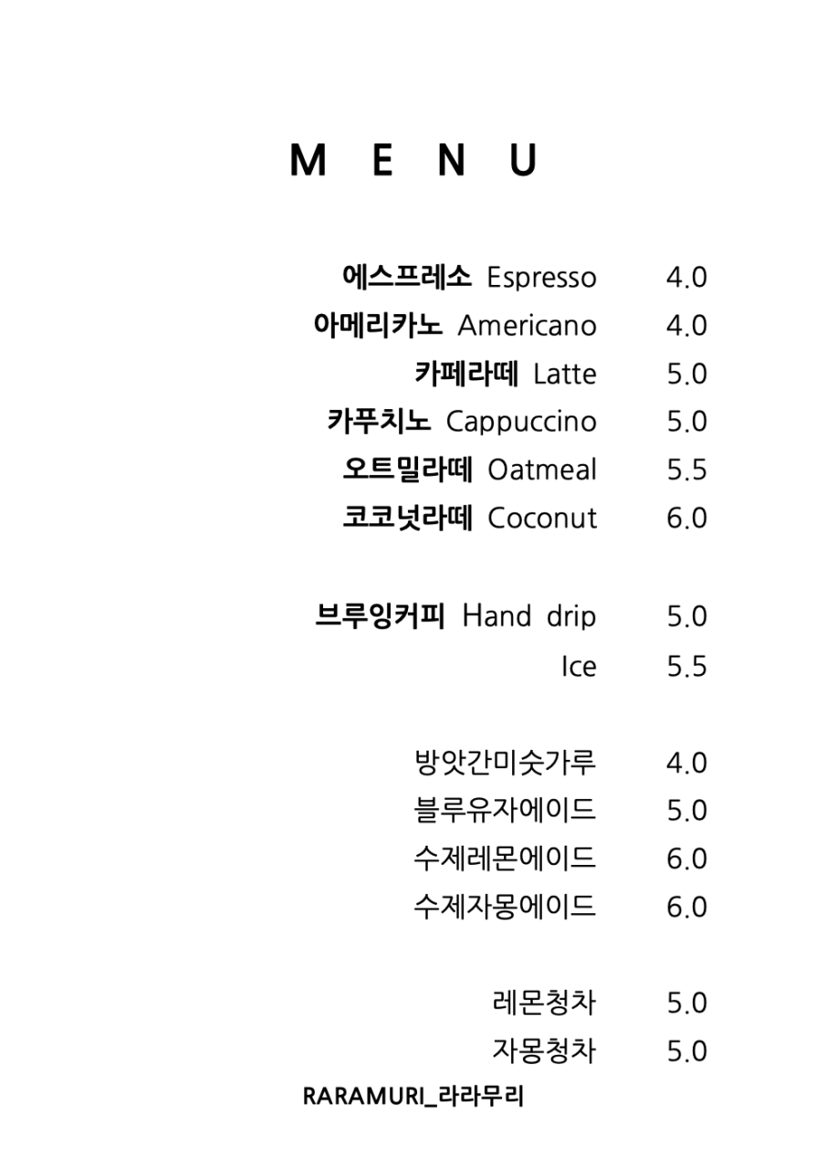 라라무리 시즌1은 등명해변. 시즌2는 괘방산 꼭대기였고 지금은 시즌3로 떠돌이 생활을 접고 이곳 연곡 송림리에 안착했습니다. 커피와 음료가 준비되어있으며 프라이빗한 시간을 원하시는 분들 환영합니다.