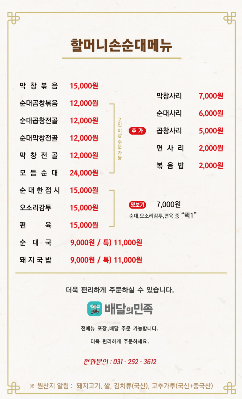푸짐한 양과 합리적인 가격은 할머니손순대의 최대 강점! 가성비를 중시하는 요즘 소비자들의 마음을 사로잡기에 충분하죠. 가족 외식이나 친구들 모임 장소로도 부담 없이 즐길 수 있어 더욱 인기랍니다.💖