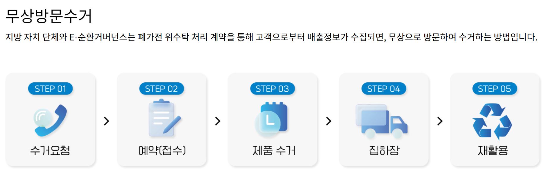 - '폐가전 방문수거 배출예약시스템' 웹사이트( www.15990903.or.kr ) 또는 '폐가전 방문수거' 어플 접속!