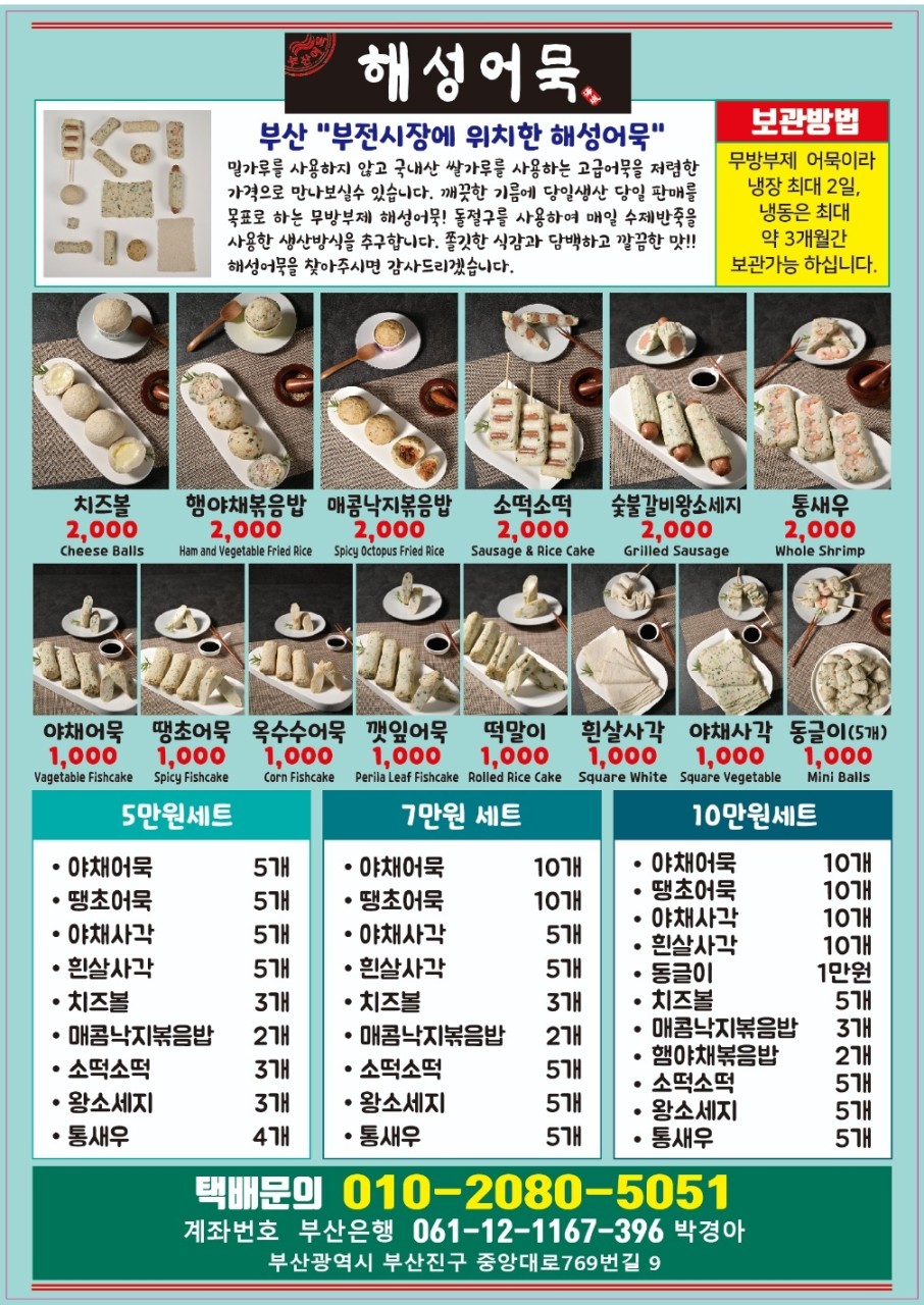 부전시장에 위치한 해성어묵 부산본점 밀가루를 사용하지 않고 국내산 쌀가루를 사용하는 고급어묵을 저렴한가격으로 만나보실수 있습니다. 깨끗한 기름에 당일 생산 당일 판매를 목표로 하는 무방부제 해성어묵. 돌절구를 이용하여 매일 수제반죽을 사용한 생산방식을 추구합니다. 쫄깃한 식감과 담백하고 깔끔한 맛!! 해성어묵을 찾아주시면 감사드리겠습니다.^^