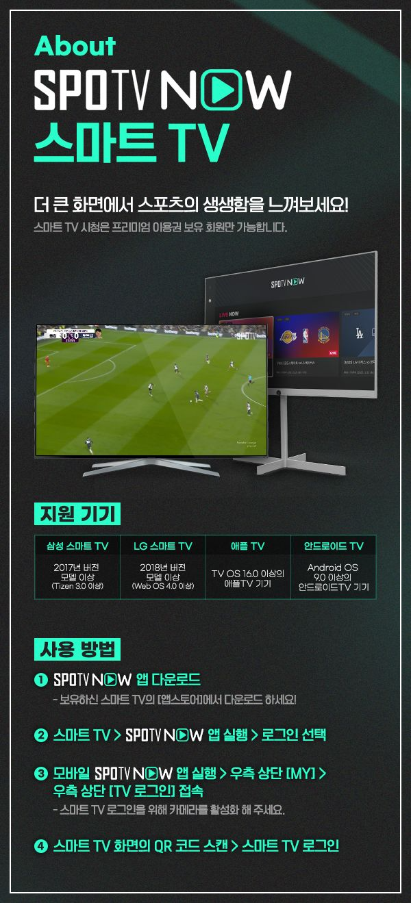 - 프리미엄 이용권을 이용 중이라면, 스마트 TV의 앱 스토어에서 'SPOTV NOW' 앱을 설치하여 큰 화면으로 경기를 시청할 수 있습니다.