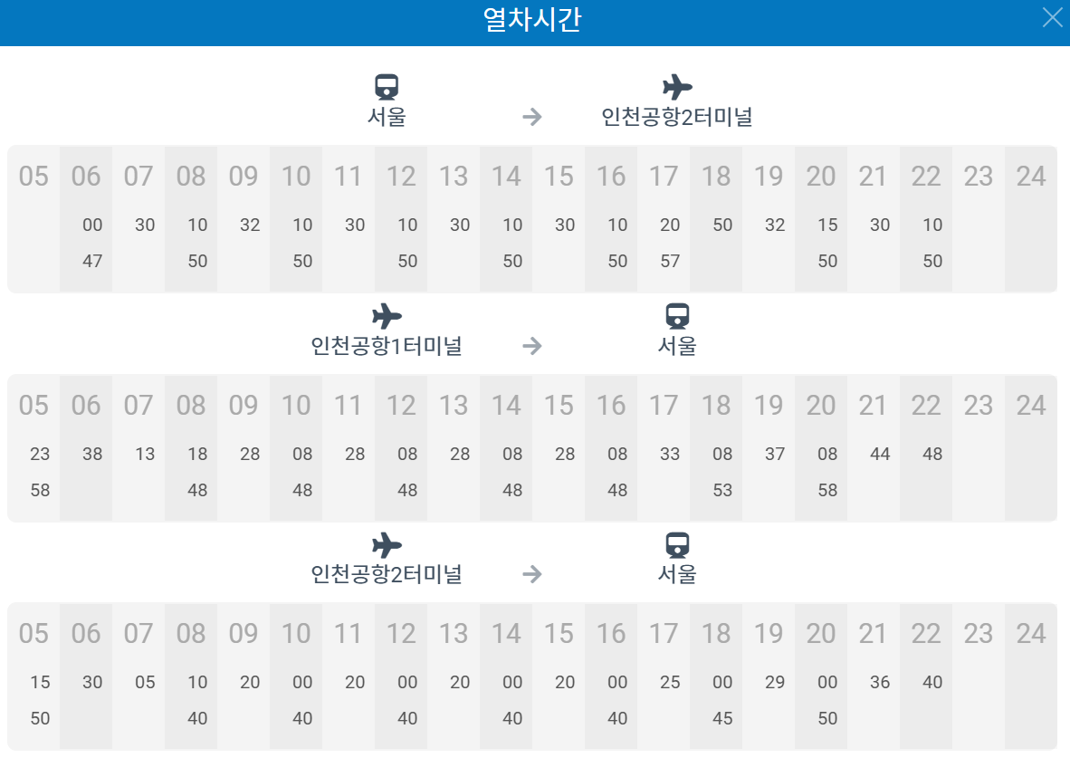 - 열차는 서울역에서 출발 후 인천공항 제1터미널과 제2터미널 순으로 정차합니다.