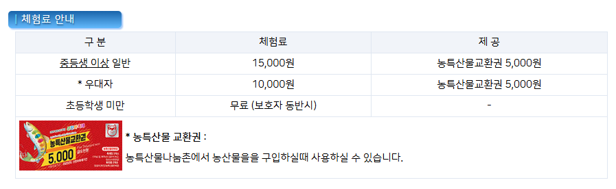 💬 A2: 산천어 낚시는 15,000원(일반), 우대자는 10,000원이며, 초등학생 미만은 무료로 체험 가능합니다.