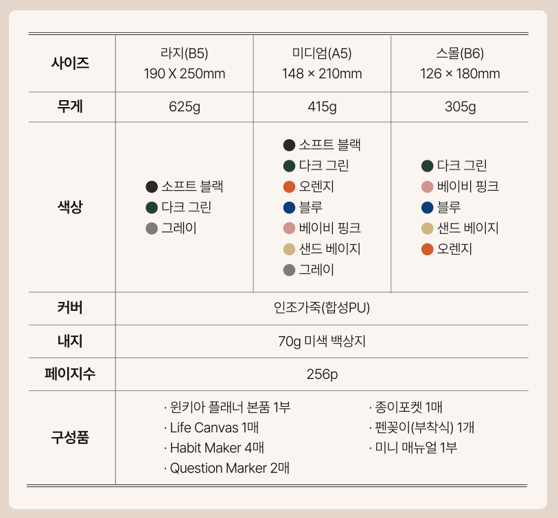 윈키아 플래너 다이어리 사이즈별 소개 및 컬러 안내