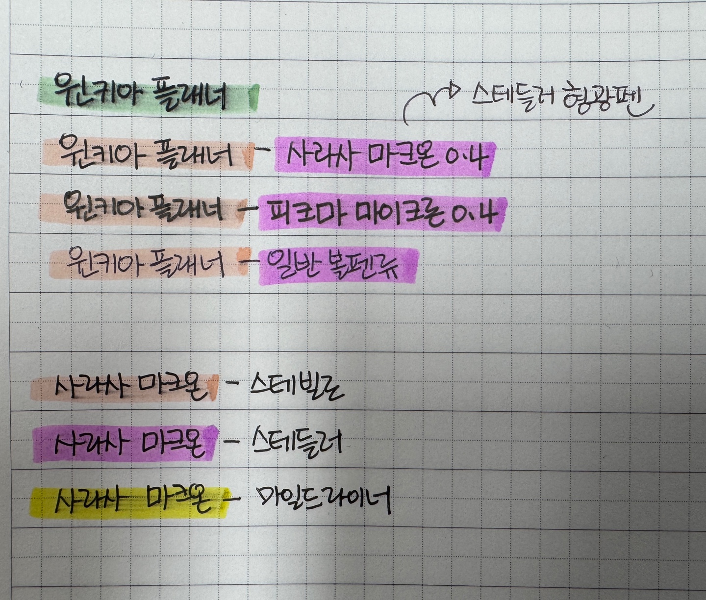 정말 많은 펜과 형광펜을 사서 일일이 확인을 한 이후 찾게된 펜과 형광펜 꿀 조합입니다.