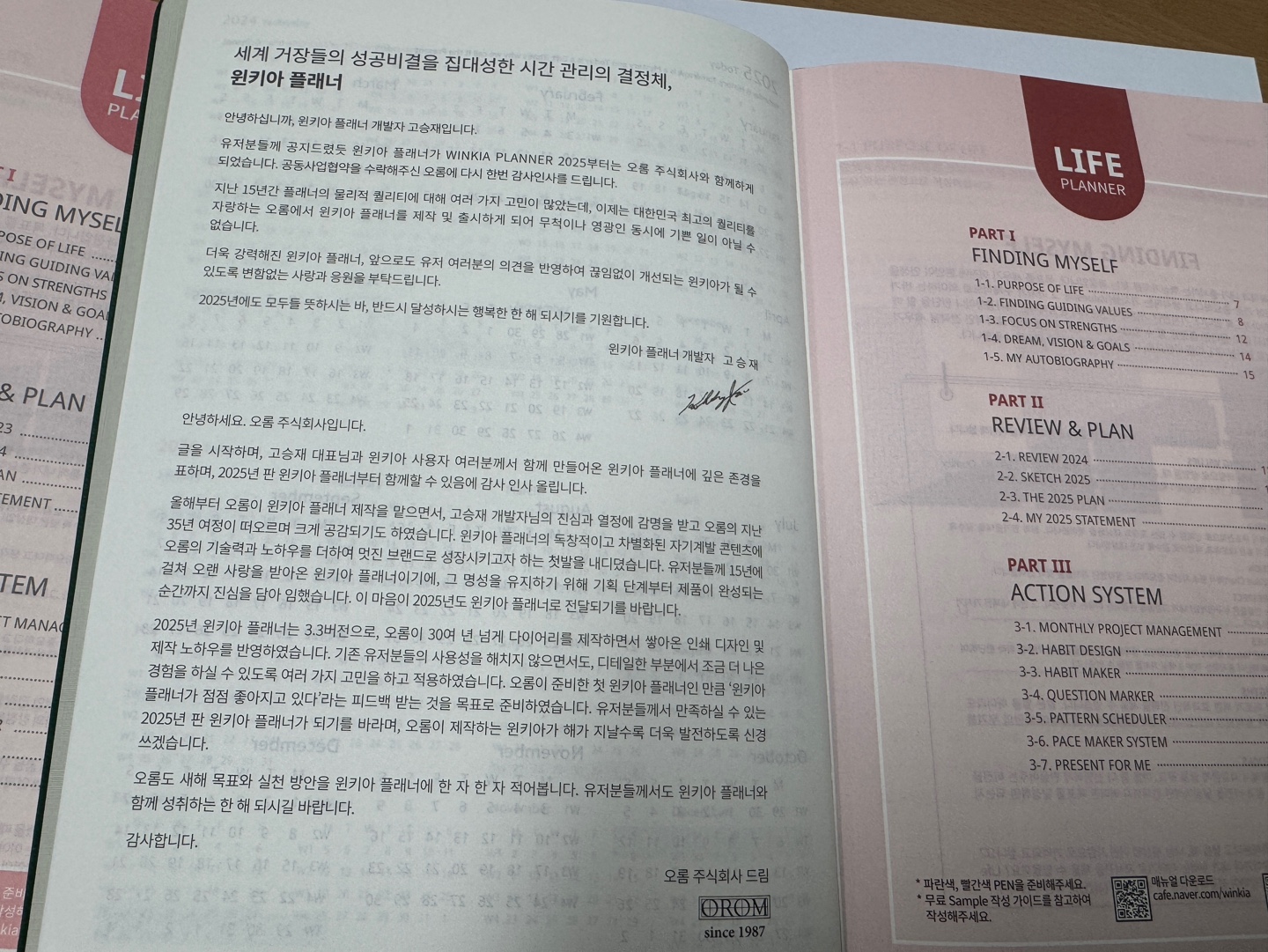 좋은 업체와 조인해서 판매쪽은 그쪽으로 맡겨도 되지 않을까 생각하턴 차에 다이어리의 명가 "오롬"에서 윈키아 플래너 다이어리 제작을 맡게 되었다는 반가운 소식을 들었습니다.