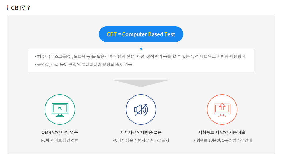 CBT(Computer-Based Test)는 컴퓨터를 이용해 시험을 진행하는 방식입니다. 응시자는 시험 이전에 국시원이 제공하는 CBT 예시 문항을 통해 시험 환경을 미리 체험할 수 있습니다.