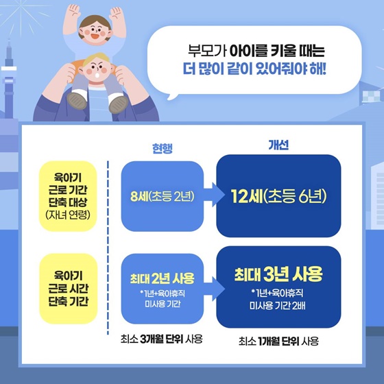 12세까지, 최대 3년! 육아기 근로시간 단축 확대!