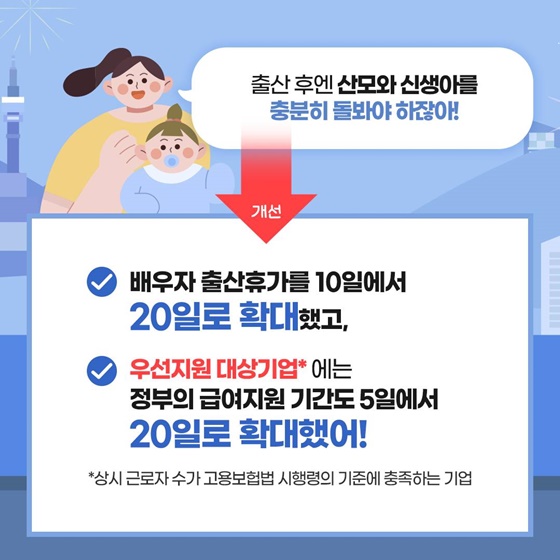 육아는 엄마 혼자만의 몫이 아니죠! 아빠의 적극적인 육아 참여를 돕기 위해 배우자 출산휴가가 10일에서 20일로 두 배 늘어났어요! 특히, 우선지원대상기업 근로자의 경우 정부에서 지원하는 급여지원 기간도 기존 5일에서 20일로 대폭 확대되었답니다. 이제 아빠도 걱정 없이 육아에 참여하고, 엄마의 육아 부담을 덜어줄 수 있게 되었어요! 함께하는 육아, 더욱 행복한 가정을 만들어갈 수 있도록 정부가 적극 지원할게요!