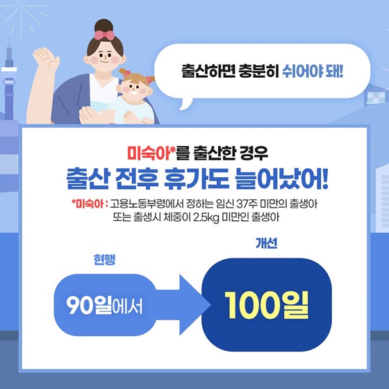 미숙아를 출산한 엄마는 일반 출산보다 더 많은 회복 시간과 아기 돌봄이 필요하다는 사실, 모두 알고 계시죠? 개정안에서는 이러한 어려움을 덜어드리고자 미숙아 출산 시 출산전후휴가를 기존 90일에서 100일로 연장 했어요! 아기의 건강과 엄마의 빠른 회복을 위해 꼭 필요한 시간이라고 생각해요. 일반 출산의 경우는 기존과 동일하게 90일이 유지된다는 점 참고해 주세요!