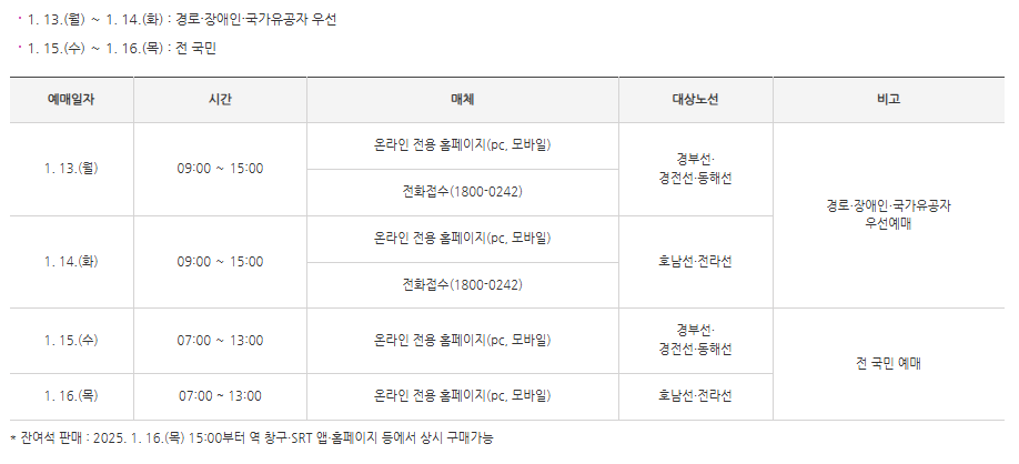 - 경로·장애인·국가유공자 우선 예매: 1월 13일(월)~14일(화) (13일: 경부·경전·동해선, 14일: 호남·전라선, 오전 9시~오후 3시) - 사회적 배려 대상자를 위한 특별 예매 기간! 잊지 마세요!