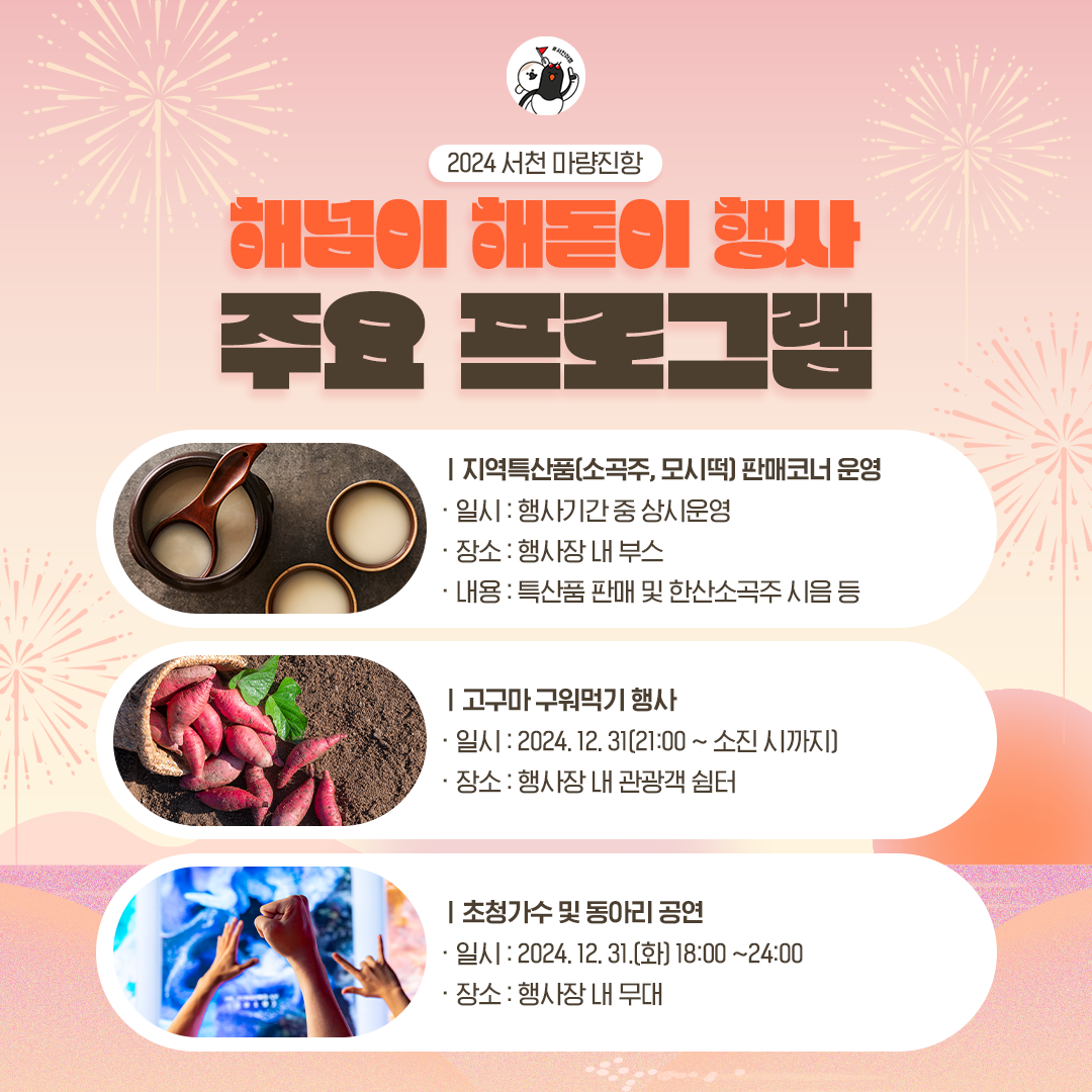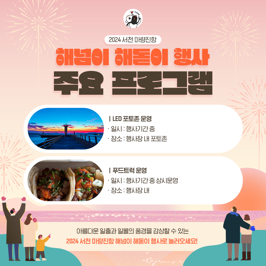 2025년 새해를 맞아 충청남도 서천군 서면 마량진항에서 열리는 '해넘이·해돋이 축제'는 한 장소에서 일몰과 일출을 모두 감상할 수 있는 특별한 행사입니다. 매년 많은 관광객이 찾아 한 해를 마무리하고 새해의 소망을 기원하는 이 축제는 다양한 프로그램으로 가득합니다.